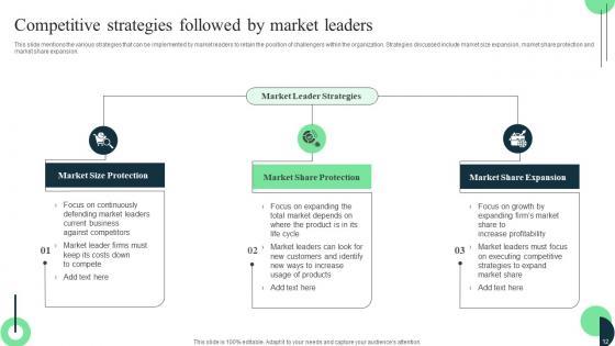 This slide mentions the various strategies that can be implemented by market leaders to retain the position of challengers within the organization. Strategies discussed include market size expansion, market share protection and market share expansion. Present like a pro with Market Leaders Guide To Influence Competitive Strategies Followed By Market Leaders Mockup Pdf Create beautiful presentations together with your team, using our easy-to-use presentation slides. Share your ideas in real-time and make changes on the fly by downloading our templates. So whether you are in the office, on the go, or in a remote location, you can stay in sync with your team and present your ideas with confidence. With Slidegeeks presentation got a whole lot easier. Grab these presentations today. This slide mentions the various strategies that can be implemented by market leaders to retain the position of challengers within the organization. Strategies discussed include market size expansion, market share protection and market share expansion.