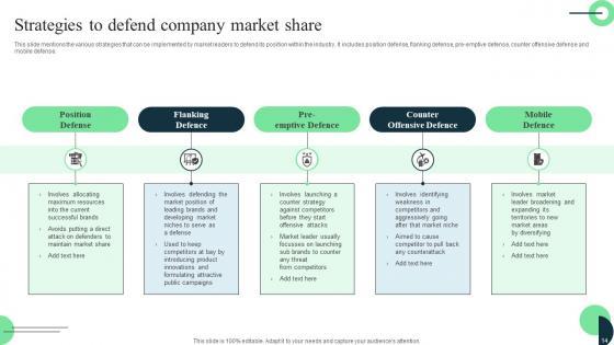 This slide mentions the various strategies that can be implemented by market leaders to defend its position within the industry. It includes position defense, flanking defense, pre-emptive defense, counter offensive defense and mobile defense. Slidegeeks has constructed Market Leaders Guide To Influence Strategies To Defend Company Market Share Download Pdf after conducting extensive research and examination. These presentation templates are constantly being generated and modified based on user preferences and critiques from editors. Here, you will find the most attractive templates for a range of purposes while taking into account ratings and remarks from users regarding the content. This is an excellent jumping-off point to explore our content and will give new users an insight into our top-notch PowerPoint Templates. This slide mentions the various strategies that can be implemented by market leaders to defend its position within the industry. It includes position defense, flanking defense, pre-emptive defense, counter offensive defense and mobile defense.