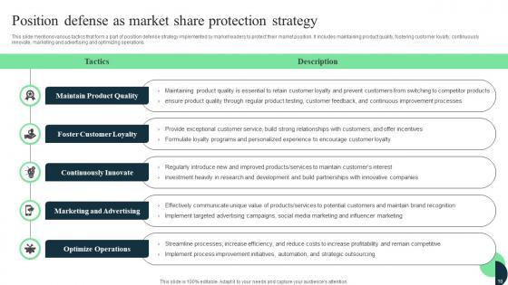 This slide mentions various tactics that form a part of position defense strategy implemented by market leaders to protect their market position. It includes maintaining product quality, fostering customer loyalty, continuously innovate, marketing and advertising and optimizing operations. The best PPT templates are a great way to save time, energy, and resources. Slidegeeks have 100 percent editable powerpoint slides making them incredibly versatile. With these quality presentation templates, you can create a captivating and memorable presentation by combining visually appealing slides and effectively communicating your message. Download Market Leaders Guide To Influence Position Defense As Market Share Protection Strategy Graphics Pdf from Slidegeeks and deliver a wonderful presentation. This slide mentions various tactics that form a part of position defense strategy implemented by market leaders to protect their market position. It includes maintaining product quality, fostering customer loyalty, continuously innovate, marketing and advertising and optimizing operations.