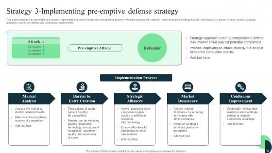This slide covers pre-emptive defense strategy implemented by market leaders to maintain their position within the industry. Key steps in implementing the strategy include market analysis, barrier to entry creation, strategic alliances, market dominance and continuous improvement. Want to ace your presentation in front of a live audience Our Market Leaders Guide To Influence Strategy 3 Implementing Pre Emptive Defense Strategy Template Pdf can help you do that by engaging all the users towards you. Slidegeeks experts have put their efforts and expertise into creating these impeccable powerpoint presentations so that you can communicate your ideas clearly. Moreover, all the templates are customizable, and easy-to-edit and downloadable. Use these for both personal and commercial use. This slide covers pre-emptive defense strategy implemented by market leaders to maintain their position within the industry. Key steps in implementing the strategy include market analysis, barrier to entry creation, strategic alliances, market dominance and continuous improvement.