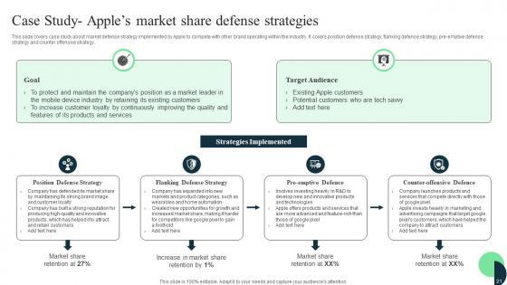 This slide covers case study about market defense strategy implemented by Apple to compete with other brand operating within the industry. It covers position defense strategy, flanking defense strategy, pre-emptive defense strategy and counter offensive strategy. Do you have to make sure that everyone on your team knows about any specific topic I yes, then you should give Market Leaders Guide To Influence Case Study Apples Market Share Defense Strategies Inspiration Pdf a try. Our experts have put a lot of knowledge and effort into creating this impeccable Market Leaders Guide To Influence Case Study Apples Market Share Defense Strategies Inspiration Pdf. You can use this template for your upcoming presentations, as the slides are perfect to represent even the tiniest detail. You can download these templates from the Slidegeeks website and these are easy to edit. So grab these today. This slide covers case study about market defense strategy implemented by Apple to compete with other brand operating within the industry. It covers position defense strategy, flanking defense strategy, pre-emptive defense strategy and counter offensive strategy.
