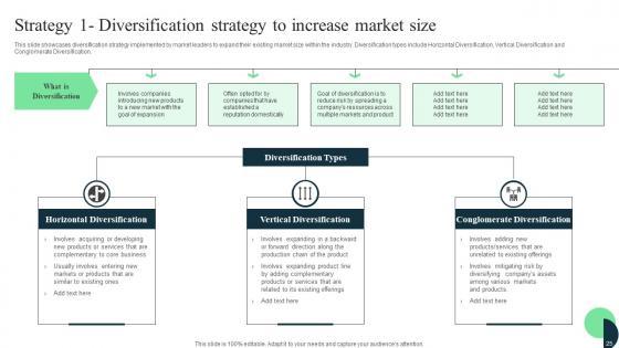 This slide showcases diversification strategy implemented by market leaders to expand their existing market size within the industry. Diversification types include Horizontal Diversification, Vertical Diversification and Conglomerate Diversification. This Market Leaders Guide To Influence Strategy 1 Diversification Strategy To Increase Market Inspiration Pdf from Slidegeeks makes it easy to present information on your topic with precision. It provides customization options, so you can make changes to the colors, design, graphics, or any other component to create a unique layout. It is also available for immediate download, so you can begin using it right away. Slidegeeks has done good research to ensure that you have everything you need to make your presentation stand out. Make a name out there for a brilliant performance. This slide showcases diversification strategy implemented by market leaders to expand their existing market size within the industry. Diversification types include Horizontal Diversification, Vertical Diversification and Conglomerate Diversification.