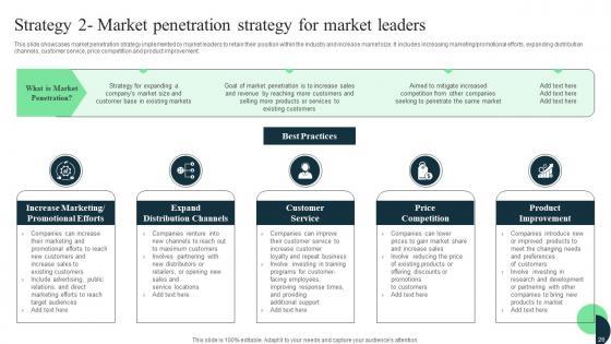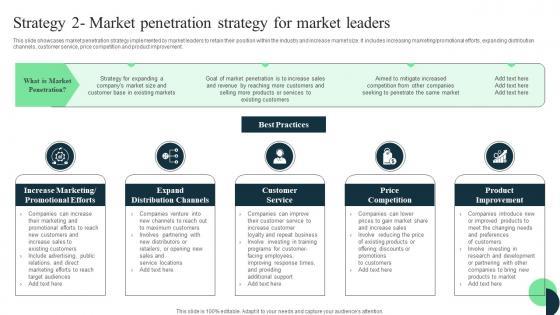 This slide showcases market penetration strategy implemented by market leaders to retain their position within the industry and increase market size. It includes increasing marketing or promotional efforts, expanding distribution channels, customer service, price competition and product improvement. Find a pre-designed and impeccable Market Leaders Guide To Influence Strategy 2 Market Penetration Strategy For Market Diagrams Pdf. The templates can ace your presentation without additional effort. You can download these easy-to-edit presentation templates to make your presentation stand out from others. So, what are you waiting for Download the template from Slidegeeks today and give a unique touch to your presentation. This slide showcases market penetration strategy implemented by market leaders to retain their position within the industry and increase market size. It includes increasing marketing or promotional efforts, expanding distribution channels, customer service, price competition and product improvement.