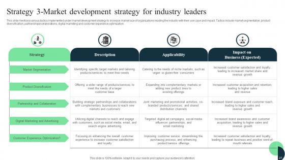 This slide mentions various tactics implemented under market development strategy to increase market size of organizations leading the industry with their use case and impact. Tactics include market segmentation, product diversification, partnerships or collaborations, digital marketing and customer experience optimization. There are so many reasons you need a Market Leaders Guide To Influence Strategy 3 Market Development Strategy For Industry Icons Pdf. The first reason is you can not spend time making everything from scratch, Thus, Slidegeeks has made presentation templates for you too. You can easily download these templates from our website easily. This slide mentions various tactics implemented under market development strategy to increase market size of organizations leading the industry with their use case and impact. Tactics include market segmentation, product diversification, partnerships or collaborations, digital marketing and customer experience optimization.