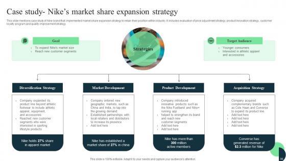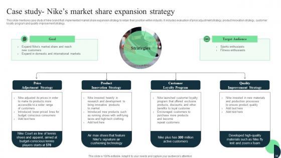 This slide mentions case study of Nike brand that implemented market share expansion strategy to retain their position within industry. It includes evaluation of price adjustment strategy, product innovation strategy, customer loyalty program and quality improvement strategy. Boost your pitch with our creative Case Study Nikes Market Share Expansion Strategy Market Leaders Guide To Influence Portrait Pdf. Deliver an awe-inspiring pitch that will mesmerize everyone. Using these presentation templates you will surely catch everyones attention. You can browse the ppts collection on our website. We have researchers who are experts at creating the right content for the templates. So you do not have to invest time in any additional work. Just grab the template now and use them. This slide mentions case study of Nike brand that implemented market share expansion strategy to retain their position within industry. It includes evaluation of price adjustment strategy, product innovation strategy, customer loyalty program and quality improvement strategy.