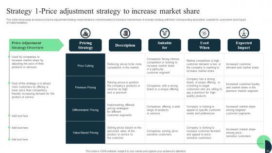 This slide showcases an analysis of price adjustment strategy implemented by market leaders to increase market share. It includes strategy with their corresponding description, suitable for, used when and impact of implementation. Take your projects to the next level with our ultimate collection of Market Leaders Guide To Influence Strategy 1 Price Adjustment Strategy To Increase Market Elements Pdf. Slidegeeks has designed a range of layouts that are perfect for representing task or activity duration, keeping track of all your deadlines at a glance. Tailor these designs to your exact needs and give them a truly corporate look with your own brand colors they well make your projects stand out from the rest. This slide showcases an analysis of price adjustment strategy implemented by market leaders to increase market share. It includes strategy with their corresponding description, suitable for, used when and impact of implementation.