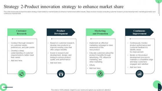 This slide showcases product innovation strategy implemented by market leaders to enhance market share within industry. Steps involved include conducting customer research, product development, marketing or promotion and continuous improvement. Boost your pitch with our creative Market Leaders Guide To Influence Strategy 2 Product Innovation Strategy To Enhance Template Pdf. Deliver an awe-inspiring pitch that will mesmerize everyone. Using these presentation templates you will surely catch everyones attention. You can browse the ppts collection on our website. We have researchers who are experts at creating the right content for the templates. So you do not have to invest time in any additional work. Just grab the template now and use them. This slide showcases product innovation strategy implemented by market leaders to enhance market share within industry. Steps involved include conducting customer research, product development, marketing or promotion and continuous improvement.