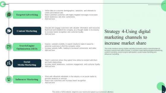 This slide mentions various digital marketing channels used by market leaders to increase market share within industry. It includes implementing targeted advertising, content marketing, search engine optimization, social media marketing and influencer marketing. From laying roadmaps to briefing everything in detail, our templates are perfect for you. You can set the stage with your presentation slides. All you have to do is download these easy-to-edit and customizable templates. Market Leaders Guide To Influence Strategy 4 Using Digital Marketing Channels To Increase Formats Pdf will help you deliver an outstanding performance that everyone would remember and praise you for. Do download this presentation today. This slide mentions various digital marketing channels used by market leaders to increase market share within industry. It includes implementing targeted advertising, content marketing, search engine optimization, social media marketing and influencer marketing.