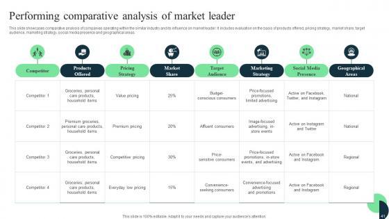 This slide showcases comparative analysis of companies operating within the similar industry and its influence on market leader. It includes evaluation on the basis of products offered, pricing strategy, market share, target audience, marketing strategy, social media presence and geographical areas. Explore a selection of the finest Market Leaders Guide To Influence Performing Comparative Analysis Of Market Leader Mockup Pdf here. With a plethora of professionally designed and pre-made slide templates, you can quickly and easily find the right one for your upcoming presentation. You can use our Market Leaders Guide To Influence Performing Comparative Analysis Of Market Leader Mockup Pdf to effectively convey your message to a wider audience. Slidegeeks has done a lot of research before preparing these presentation templates. The content can be personalized and the slides are highly editable. Grab templates today from Slidegeeks. This slide showcases comparative analysis of companies operating within the similar industry and its influence on market leader. It includes evaluation on the basis of products offered, pricing strategy, market share, target audience, marketing strategy, social media presence and geographical areas.