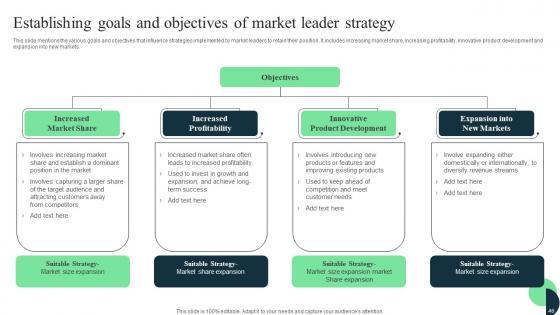 This slide mentions the various goals and objectives that influence strategies implemented by market leaders to retain their position. It includes increasing market share, increasing profitability, innovative product development and expansion into new markets. If your project calls for a presentation, then Slidegeeks is your go-to partner because we have professionally designed, easy-to-edit templates that are perfect for any presentation. After downloading, you can easily edit Market Leaders Guide To Influence Establishing Goals And Objectives Of Market Leader Ideas Pdf and make the changes accordingly. You can rearrange slides or fill them with different images. Check out all the handy templates This slide mentions the various goals and objectives that influence strategies implemented by market leaders to retain their position. It includes increasing market share, increasing profitability, innovative product development and expansion into new markets.