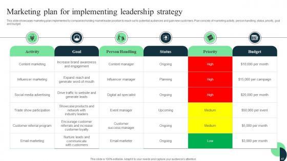 This slide showcases marketing plan implemented by companies holding market leader position to reach out to potential audiences and gain new customers. Plan consists of marketing activity, person handling, status, priority, goal and budget. Welcome to our selection of the Market Leaders Guide To Influence Marketing Plan For Implementing Leadership Strategy Mockup Pdf. These are designed to help you showcase your creativity and bring your sphere to life. Planning and Innovation are essential for any business that is just starting out. This collection contains the designs that you need for your everyday presentations. All of our PowerPoints are 100 percent editable, so you can customize them to suit your needs. This multi-purpose template can be used in various situations. Grab these presentation templates today. This slide showcases marketing plan implemented by companies holding market leader position to reach out to potential audiences and gain new customers. Plan consists of marketing activity, person handling, status, priority, goal and budget.