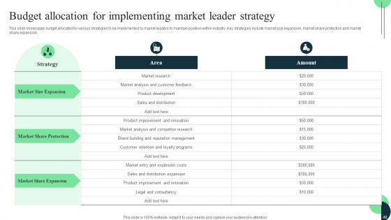 This slide showcases budget allocated for various strategies to be implemented by market leaders to maintain position within industry. Key strategies include market size expansion, market share protection and market share expansion. There are so many reasons you need a Market Leaders Guide To Influence Budget Allocation For Implementing Market Leader Ideas Pdf. The first reason is you can not spend time making everything from scratch, Thus, Slidegeeks has made presentation templates for you too. You can easily download these templates from our website easily. This slide showcases budget allocated for various strategies to be implemented by market leaders to maintain position within industry. Key strategies include market size expansion, market share protection and market share expansion.