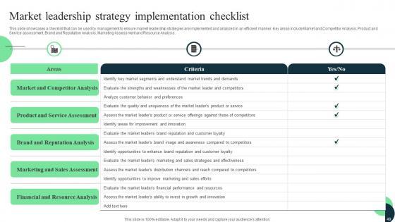 This slide showcases a checklist that can be used by management to ensure market leadership strategies are implemented and analyzed in an efficient manner. Key areas include Market and Competitor Analysis, Product and Service assessment, Brand and Reputation Analysis, Marketing Assessment and Resource Analysis. This modern and well-arranged Market Leaders Guide To Influence Market Leadership Strategy Implementation Checklist Inspiration Pdf provides lots of creative possibilities. It is very simple to customize and edit with the Powerpoint Software. Just drag and drop your pictures into the shapes. All facets of this template can be edited with Powerpoint no extra software is necessary. Add your own material, put your images in the places assigned for them, adjust the colors, and then you can show your slides to the world, with an animated slide included. This slide showcases a checklist that can be used by management to ensure market leadership strategies are implemented and analyzed in an efficient manner. Key areas include Market and Competitor Analysis, Product and Service assessment, Brand and Reputation Analysis, Marketing Assessment and Resource Analysis.
