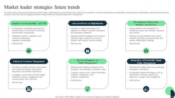 This slide mentions various trends that can be seen in future implemented by market leaders to stay ahead of its competitors. It includes emphasizing on sustainability, increasing focus on digitalization, development of innovative products, enhanced customer engagement, talent management and sustainable supply chain management. Coming up with a presentation necessitates that the majority of the effort goes into the content and the message you intend to convey. The visuals of a PowerPoint presentation can only be effective if it supplements and supports the story that is being told. Keeping this in mind our experts created Market Leaders Guide To Influence Market Leader Strategies Future Trends Professional Pdf to reduce the time that goes into designing the presentation. This way, you can concentrate on the message while our designers take care of providing you with the right template for the situation. This slide mentions various trends that can be seen in future implemented by market leaders to stay ahead of its competitors. It includes emphasizing on sustainability, increasing focus on digitalization, development of innovative products, enhanced customer engagement, talent management and sustainable supply chain management.