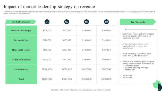 This slide showcases the impact of implementing market leadership strategy on revenue of various product categories across four quarters. Product categories evaluated include food and beverages, personal care, household goods, health or beauty and confectionary. Are you in need of a template that can accommodate all of your creative concepts This one is crafted professionally and can be altered to fit any style. Use it with Google Slides or PowerPoint. Include striking photographs, symbols, depictions, and other visuals. Fill, move around, or remove text boxes as desired. Test out color palettes and font mixtures. Edit and save your work, or work with colleagues. Download Market Leaders Guide To Influence Impact Of Market Leadership Strategy On Revenue Themes Pdf and observe how to make your presentation outstanding. Give an impeccable presentation to your group and make your presentation unforgettable. This slide showcases the impact of implementing market leadership strategy on revenue of various product categories across four quarters. Product categories evaluated include food and beverages, personal care, household goods, health or beauty and confectionary.