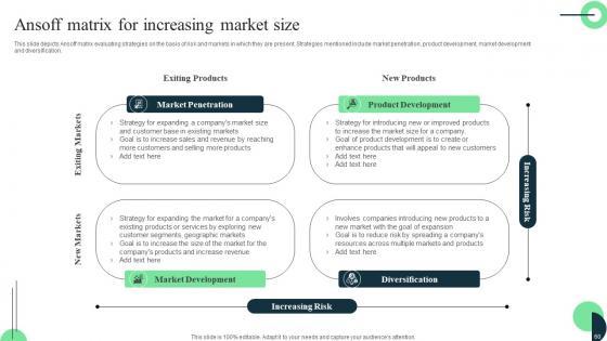 This slide depicts Ansoff matrix evaluating strategies on the basis of risk and markets in which they are present. Strategies mentioned include market penetration, product development, market development and diversification. Want to ace your presentation in front of a live audience Our Market Leaders Guide To Influence Ansoff Matrix For Increasing Market Size Topics Pdf can help you do that by engaging all the users towards you. Slidegeeks experts have put their efforts and expertise into creating these impeccable powerpoint presentations so that you can communicate your ideas clearly. Moreover, all the templates are customizable, and easy-to-edit and downloadable. Use these for both personal and commercial use. This slide depicts Ansoff matrix evaluating strategies on the basis of risk and markets in which they are present. Strategies mentioned include market penetration, product development, market development and diversification.