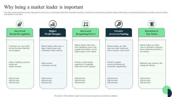 This slide mentions the reasons why organizations strive to be a market leader within their respective industries. It includes increased brand recognition, higher profit margins, increased bargaining power, greater access to funding and retention of top talent. If your project calls for a presentation, then Slidegeeks is your go-to partner because we have professionally designed, easy-to-edit templates that are perfect for any presentation. After downloading, you can easily edit Market Leaders Guide To Influence Why Being A Market Leader Is Important Infographics Pdf and make the changes accordingly. You can rearrange slides or fill them with different images. Check out all the handy templates This slide mentions the reasons why organizations strive to be a market leader within their respective industries. It includes increased brand recognition, higher profit margins, increased bargaining power, greater access to funding and retention of top talent.