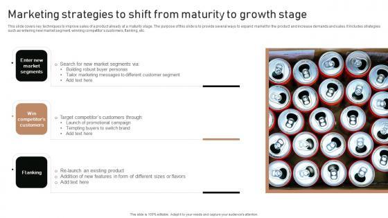 This slide covers key techniques to improve sales of a product already at a maturity stage. The purpose of this slide is to provide several ways to expand market for the product and increase demands and sales. It includes strategies such as entering new market segment, winning competitors customers, flanking, etc. Do you have an important presentation coming up Are you looking for something that will make your presentation stand out from the rest Look no further than Marketing Strategies To Shift From Maturity To Growth Stage Designs PDF. With our professional designs, you can trust that your presentation will pop and make delivering it a smooth process. And with Slidegeeks, you can trust that your presentation will be unique and memorable. So why wait Grab Marketing Strategies To Shift From Maturity To Growth Stage Designs PDF today and make your presentation stand out from the rest.