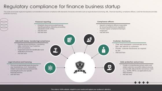 This slide showcases legal and regulatory considerations to ensure compliance with standards. It includes elements such as legal structure and licensing, AML, financial reporting, compliance officers, customer disclosures and data protection and privacy. Take your projects to the next level with our ultimate collection of Regulatory Compliance For Finance Business Startup Penetrating Markets With Financial Strategy SS V. Slidegeeks has designed a range of layouts that are perfect for representing task or activity duration, keeping track of all your deadlines at a glance. Tailor these designs to your exact needs and give them a truly corporate look with your own brand colors they will make your projects stand out from the rest This slide showcases legal and regulatory considerations to ensure compliance with standards. It includes elements such as legal structure and licensing, AML, financial reporting, compliance officers, customer disclosures and data protection and privacy.
