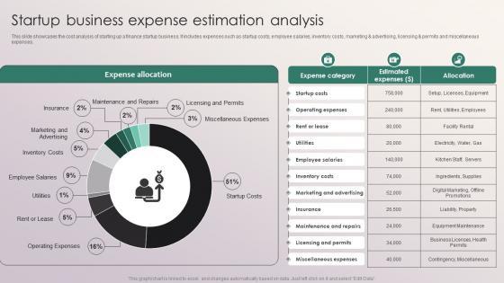 This slide showcases the cost analysis of starting up a finance startup business. It includes expenses such as startup costs, employee salaries, inventory costs, marketing and advertising, licensing and permits and miscellaneous expenses. Do you know about Slidesgeeks Startup Business Expense Estimation Analysis Penetrating Markets With Financial Strategy SS V These are perfect for delivering any kind od presentation. Using it, create PowerPoint presentations that communicate your ideas and engage audiences. Save time and effort by using our pre designed presentation templates that are perfect for a wide range of topic. Our vast selection of designs covers a range of styles, from creative to business, and are all highly customizable and easy to edit. Download as a PowerPoint template or use them as Google Slides themes. This slide showcases the cost analysis of starting up a finance startup business. It includes expenses such as startup costs, employee salaries, inventory costs, marketing and advertising, licensing and permits and miscellaneous expenses.