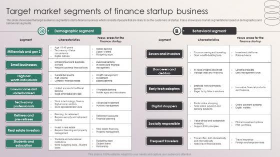 This slide showcases the target audience segments to start a finance business which consists of people that are likely to be the customers of startup. It also showcases market segmentations based on demographics and behavioral segments. Boost your pitch with our creative Target Market Segments Of Finance Startup Business Penetrating Markets With Financial Strategy SS V. Deliver an awe inspiring pitch that will mesmerize everyone. Using these presentation templates you will surely catch everyones attention. You can browse the ppts collection on our website. We have researchers who are experts at creating the right content for the templates. So you do not have to invest time in any additional work. Just grab the template now and use them. This slide showcases the target audience segments to start a finance business which consists of people that are likely to be the customers of startup. It also showcases market segmentations based on demographics and behavioral segments.
