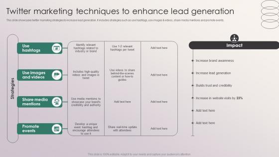 This slide showcases twitter marketing strategies to increase lead generation. It includes strategies such as use hashtags, use images and videos, share media mentions and promote events. Want to ace your presentation in front of a live audience Our Twitter Marketing Techniques To Enhance Lead Generation Penetrating Markets With Financial Strategy SS V can help you do that by engaging all the users towards you. Slidegeeks experts have put their efforts and expertise into creating these impeccable powerpoint presentations so that you can communicate your ideas clearly. Moreover, all the templates are customizable, and easy to edit and downloadable. Use these for both personal and commercial use. This slide showcases twitter marketing strategies to increase lead generation. It includes strategies such as use hashtags, use images and videos, share media mentions and promote events.