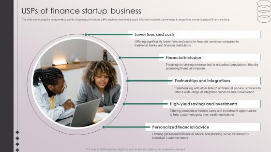 This slide showcases the unique selling points of business. It includes USPs such as lower fees and costs, financial inclusion, partnerships and integrations and personalized financial advice. There are so many reasons you need a USPS Of Finance Startup Business Penetrating Markets With Financial Strategy SS V. The first reason is you can not spend time making everything from scratch, Thus, Slidegeeks has made presentation templates for you too. You can easily download these templates from our website easily. This slide showcases the unique selling points of business. It includes USPs such as lower fees and costs, financial inclusion, partnerships and integrations and personalized financial advice.