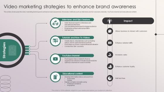 This slides showcases the video marketing techniques to enhance brand awareness. It includes methods such as interviews and QA sessions, tutorials, YouTube channel and educational content. Do you have to make sure that everyone on your team knows about any specific topic I yes, then you should give Video Marketing Strategies To Enhance Brand Awareness Penetrating Markets With Financial Strategy SS V a try. Our experts have put a lot of knowledge and effort into creating this impeccable Video Marketing Strategies To Enhance Brand Awareness Penetrating Markets With Financial Strategy SS V. You can use this template for your upcoming presentations, as the slides are perfect to represent even the tiniest detail. You can download these templates from the Slidegeeks website and these are easy to edit. So grab these today This slides showcases the video marketing techniques to enhance brand awareness. It includes methods such as interviews and QA sessions, tutorials, YouTube channel and educational content.