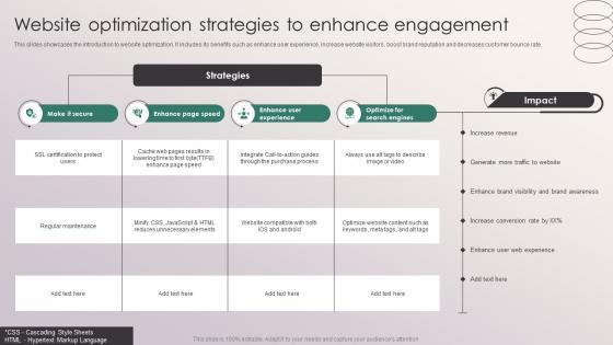 This slides showcases the introduction to website optimization. It includes its benefits such as enhance user experience, increase website visitors, boost brand reputation and decreases customer bounce rate. Get a simple yet stunning designed Website Optimization Strategies To Enhance Engagement Penetrating Markets With Financial Strategy SS V. It is the best one to establish the tone in your meetings. It is an excellent way to make your presentations highly effective. So, download this PPT today from Slidegeeks and see the positive impacts. Our easy to edit Website Optimization Strategies To Enhance Engagement Penetrating Markets With Financial Strategy SS V can be your go to option for all upcoming conferences and meetings. So, what are you waiting for Grab this template today. This slides showcases the introduction to website optimization. It includes its benefits such as enhance user experience, increase website visitors, boost brand reputation and decreases customer bounce rate.