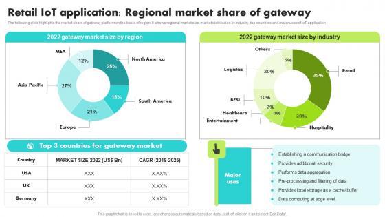 The following slide highlights the market share of gateway platform on the basis of region. It shows regional market size, market distribution by industry, top countries and major uses of IoT application Present like a pro with Guide For Retail IoT Solutions Analysis Retail IoT Application Regional Market Graphics Pdf Create beautiful presentations together with your team, using our easy to use presentation slides. Share your ideas in real time and make changes on the fly by downloading our templates. So whether you are in the office, on the go, or in a remote location, you can stay in sync with your team and present your ideas with confidence. With Slidegeeks presentation got a whole lot easier. Grab these presentations today. The following slide highlights the market share of gateway platform on the basis of region. It shows regional market size, market distribution by industry, top countries and major uses of IoT application