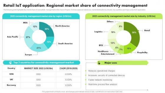 The following slide highlights the market share of connectivity management on the basis of region. It shows regional market size, market distribution by industry, top countries and major uses of IoT application The best PPT templates are a great way to save time, energy, and resources. Slidegeeks have 100 percent editable powerpoint slides making them incredibly versatile. With these quality presentation templates, you can create a captivating and memorable presentation by combining visually appealing slides and effectively communicating your message. Download Retail IoT Application Regional Market Share Guide For Retail IoT Solutions Analysis Guidelines Pdf from Slidegeeks and deliver a wonderful presentation. The following slide highlights the market share of connectivity management on the basis of region. It shows regional market size, market distribution by industry, top countries and major uses of IoT application