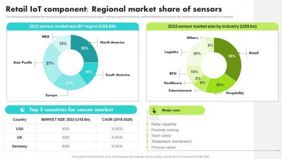 The following slide highlights the market share of IoT sensors on the basis of region. It shows regional market size, market distribution by industry, top countries and major uses of IoT component Slidegeeks has constructed Retail IoT Component Regional Market Share Guide For Retail IoT Solutions Analysis Formats Pdf after conducting extensive research and examination. These presentation templates are constantly being generated and modified based on user preferences and critiques from editors. Here, you will find the most attractive templates for a range of purposes while taking into account ratings and remarks from users regarding the content. This is an excellent jumping off point to explore our content and will give new users an insight into our top notch PowerPoint Templates. The following slide highlights the market share of IoT sensors on the basis of region. It shows regional market size, market distribution by industry, top countries and major uses of IoT component