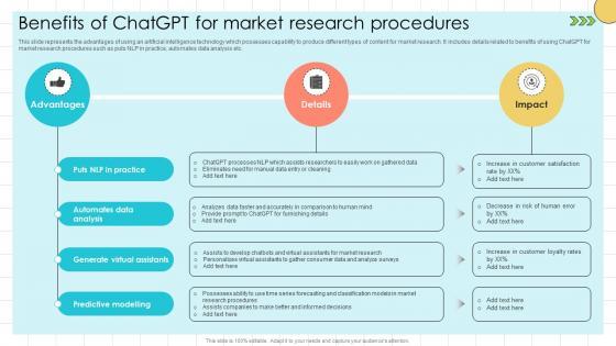 This slide represents the advantages of using an artificial intelligence technology which possesses capability to produce different types of content for market research. It includes details related to benefits of using ChatGPT for market research procedures such as puts NLP in practice, automates data analysis etc. Get a simple yet stunning designed Chat GPT Prompts For Market Benefits Of ChatGPT For Market Research ChatGPT SS V. It is the best one to establish the tone in your meetings. It is an excellent way to make your presentations highly effective. So, download this PPT today from Slidegeeks and see the positive impacts. Our easy-to-edit Chat GPT Prompts For Market Benefits Of ChatGPT For Market Research ChatGPT SS V can be your go-to option for all upcoming conferences and meetings. So, what are you waiting for Grab this template today. This slide represents the advantages of using an artificial intelligence technology which possesses capability to produce different types of content for market research. It includes details related to benefits of using ChatGPT for market research procedures such as puts NLP in practice, automates data analysis etc.