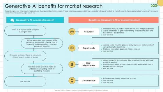 This slide represents details related to advantages of using an artificial intelligence technology which possesses capability to produce different types of content, for market research. It includes benefits of generative AI for market research such as accuracy, rapid results etc. Coming up with a presentation necessitates that the majority of the effort goes into the content and the message you intend to convey. The visuals of a PowerPoint presentation can only be effective if it supplements and supports the story that is being told. Keeping this in mind our experts created Chat GPT Prompts For Market Generative AI Benefits For Market Research ChatGPT SS V to reduce the time that goes into designing the presentation. This way, you can concentrate on the message while our designers take care of providing you with the right template for the situation. This slide represents details related to advantages of using an artificial intelligence technology which possesses capability to produce different types of content, for market research. It includes benefits of generative AI for market research such as accuracy, rapid results etc.