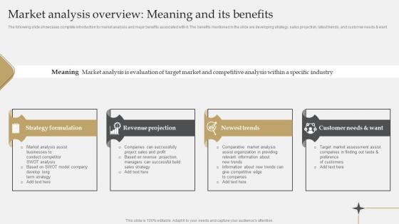 The following slide showcases complete introduction to market analysis and major benefits associated with it. The benefits mentioned in the slide are developing strategy, sales projection, latest trends, and customer needs and want. Find highly impressive IT Industry Market Research Market Analysis Overview Meaning And Its Benefits Professional Pdf on Slidegeeks to deliver a meaningful presentation. You can save an ample amount of time using these presentation templates. No need to worry to prepare everything from scratch because Slidegeeks experts have already done a huge research and work for you. You need to download IT Industry Market Research Market Analysis Overview Meaning And Its Benefits Professional Pdf for your upcoming presentation. All the presentation templates are 100 percent editable and you can change the color and personalize the content accordingly. Download now. The following slide showcases complete introduction to market analysis and major benefits associated with it. The benefits mentioned in the slide are developing strategy, sales projection, latest trends, and customer needs and want.
