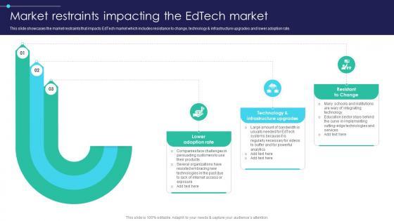 This slide showcases the market restraints that impacts EdTech market which includes resistance to change, technology and infrastructure upgrades and lower adoption rate. Do you know about Slidesgeeks Global Digital Education Market Restraints Impacting The Edtech Market IR SS V These are perfect for delivering any kind od presentation. Using it, create PowerPoint presentations that communicate your ideas and engage audiences. Save time and effort by using our pre-designed presentation templates that are perfect for a wide range of topic. Our vast selection of designs covers a range of styles, from creative to business, and are all highly customizable and easy to edit. Download as a PowerPoint template or use them as Google Slides themes. This slide showcases the market restraints that impacts EdTech market which includes resistance to change, technology and infrastructure upgrades and lower adoption rate.