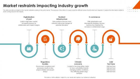 The slide provides an insight on the market restraints existing in the ports market. The purpose of this slide is to aware about the different areas of ports which are impacted. It capture the information related to short comings faced in the industry. Retrieve professionally designed Market Restraints Impacting Port Terminal Industry Ppt Presentation to effectively convey your message and captivate your listeners. Save time by selecting pre made slideshows that are appropriate for various topics, from business to educational purposes. These themes come in many different styles, from creative to corporate, and all of them are easily adjustable and can be edited quickly. Access them as PowerPoint templates or as Google Slides themes. You do not have to go on a hunt for the perfect presentation because Slidegeeks got you covered from everywhere. The slide provides an insight on the market restraints existing in the ports market. The purpose of this slide is to aware about the different areas of ports which are impacted. It capture the information related to short comings faced in the industry.