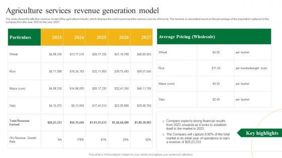 The slide shows the effective revenue model of the agriculture industry, which displays the cost incurred and the various sources of income. The revenue is calculated based on the percentage of the population captured by the company from the year 2023 to the year 2027. Coming up with a presentation necessitates that the majority of the effort goes into the content and the message you intend to convey. The visuals of a PowerPoint presentation can only be effective if it supplements and supports the story that is being told. Keeping this in mind our experts created Agriculture Services Revenue Generation Agriculture Business Plan Go To Market Strategy Slides Pdf to reduce the time that goes into designing the presentation. This way, you can concentrate on the message while our designers take care of providing you with the right template for the situation. The slide shows the effective revenue model of the agriculture industry, which displays the cost incurred and the various sources of income. The revenue is calculated based on the percentage of the population captured by the company from the year 2023 to the year 2027.