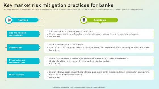 This slide shows details regarding various practices which can be used by commercial banks to manage market risk. It includes strategies such as risk measurement and monitoring, diversification, stress testing, etc. Presenting this PowerPoint presentation, titled Key Market Risk Mitigation Practices For Banks Complete Guide On Managing Banking Fin SS V, with topics curated by our researchers after extensive research. This editable presentation is available for immediate download and provides attractive features when used. Download now and captivate your audience. Presenting this Key Market Risk Mitigation Practices For Banks Complete Guide On Managing Banking Fin SS V. Our researchers have carefully researched and created these slides with all aspects taken into consideration. This is a completely customizable Key Market Risk Mitigation Practices For Banks Complete Guide On Managing Banking Fin SS V that is available for immediate downloading. Download now and make an impact on your audience. Highlight the attractive features available with our PPTs. This slide shows details regarding various practices which can be used by commercial banks to manage market risk. It includes strategies such as risk measurement and monitoring, diversification, stress testing, etc.