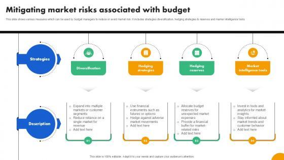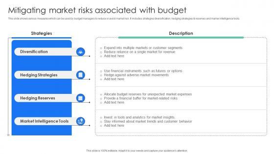 This slide shows various measures which can be used by budget managers to reduce or avoid market risk. It includes strategies diversification, hedging strategies and reserves and marker intelligence tools. The best PPT templates are a great way to save time, energy, and resources. Slidegeeks have 100 percent editable powerpoint slides making them incredibly versatile. With these quality presentation templates, you can create a captivating and memorable presentation by combining visually appealing slides and effectively communicating your message. Download Mitigating Market Risks Associated With Budget Effective And Efficient Tools To Develop Fin SS V from Slidegeeks and deliver a wonderful presentation. This slide shows various measures which can be used by budget managers to reduce or avoid market risk. It includes strategies diversification, hedging strategies and reserves and marker intelligence tools.