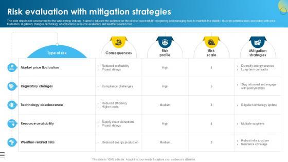 The slide depicts risk assessment for the wind energy industry. It aims to educate the audience on the need of successfully recognizing and managing risks to maintain the stability. It covers potential risks associated with price fluctuation, regulatory changes, technology obsolescence, resource availability and weather-related risks. Slidegeeks has constructed Risk Evaluation With Mitigation Global Wind Power Market PPT Sample IR SS V after conducting extensive research and examination. These presentation templates are constantly being generated and modified based on user preferences and critiques from editors. Here, you will find the most attractive templates for a range of purposes while taking into account ratings and remarks from users regarding the content. This is an excellent jumping-off point to explore our content and will give new users an insight into our top-notch PowerPoint Templates. The slide depicts risk assessment for the wind energy industry. It aims to educate the audience on the need of successfully recognizing and managing risks to maintain the stability. It covers potential risks associated with price fluctuation, regulatory changes, technology obsolescence, resource availability and weather-related risks.
