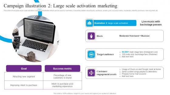 This slide showcases large scale activation marketing illustration which can be used by marketers. It provides details about hosts, audience, assets, goal, success metric, moderator, intent to purchase, new segment, etc. Slidegeeks is one of the best resources for PowerPoint templates. You can download easily and regulate Campaign Illustration 2 Large Scale Activation Marketing Inspiration PDF for your personal presentations from our wonderful collection. A few clicks is all it takes to discover and get the most relevant and appropriate templates. Use our Templates to add a unique zing and appeal to your presentation and meetings. All the slides are easy to edit and you can use them even for advertisement purposes.