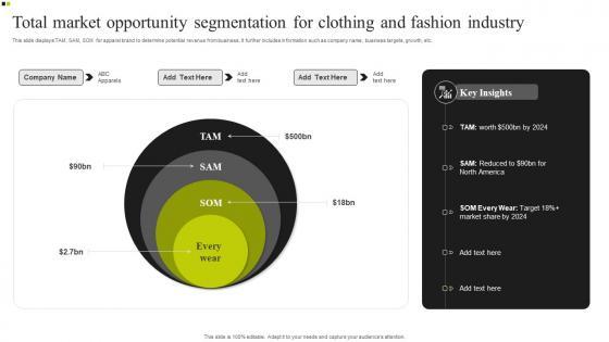 This slide displays TAM, SAM, SOM for apparel brand to determine potential revenue from business. It further includes information such as company name, business targets, growth, etc. Pitch your topic with ease and precision using this Total Market Opportunity Segmentation For Clothing And Fashion Industry Structure Pdf. This layout presents information on Total Market Opportunity, Segmentation For Clothing, Revenue From Business. It is also available for immediate download and adjustment. So, changes can be made in the color, design, graphics or any other component to create a unique layout. This slide displays TAM, SAM, SOM for apparel brand to determine potential revenue from business. It further includes information such as company name, business targets, growth, etc.