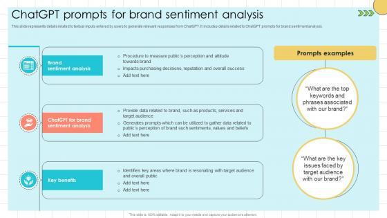 This slide represents details related to textual inputs entered by users to generate relevant responses from ChatGPT. It includes details related to ChatGPT prompts for brand sentiment analysis. Do you have an important presentation coming up Are you looking for something that will make your presentation stand out from the rest Look no further than Chat GPT Prompts For Market ChatGPT Prompts For Brand Sentiment ChatGPT SS V. With our professional designs, you can trust that your presentation will pop and make delivering it a smooth process. And with Slidegeeks, you can trust that your presentation will be unique and memorable. So why wait Grab Chat GPT Prompts For Market ChatGPT Prompts For Brand Sentiment ChatGPT SS V today and make your presentation stand out from the rest This slide represents details related to textual inputs entered by users to generate relevant responses from ChatGPT. It includes details related to ChatGPT prompts for brand sentiment analysis.