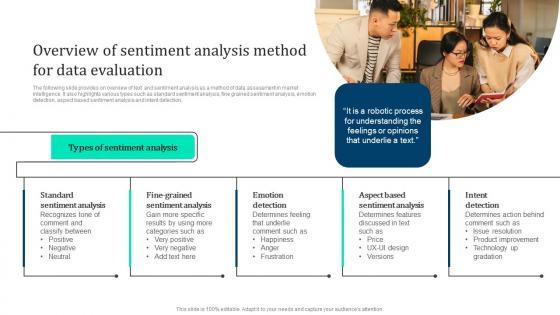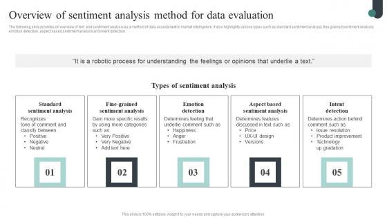 The following slide provides on overview of text and sentiment analysis as a method of data assessment in market intelligence. It also highlights various types such as standard sentiment analysis, fine grained sentiment analysis, emotion detection, aspect based sentiment analysis and intent detection. Find a pre designed and impeccable Strategic Market Insight Implementation Guide Overview Of Sentiment Analysis Method For Data Evaluation Slides PDF. The templates can ace your presentation without additional effort. You can download these easy to edit presentation templates to make your presentation stand out from others. So, what are you waiting for Download the template from Slidegeeks today and give a unique touch to your presentation.