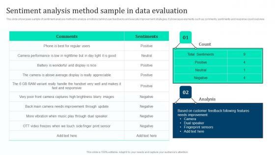 This slide showcases sample of sentiment analysis method to analyze emotions behind user feedbacks and execute improvement strategies. It showcases elements such as comments, sentiments and response count overview. There are so many reasons you need a Strategic Market Insight Implementation Guide Sentiment Analysis Method Sample In Data Evaluation Sample PDF. The first reason is you cannot spend time making everything from scratch, Thus, Slidegeeks has made presentation templates for you too. You can easily download these templates from our website easily.