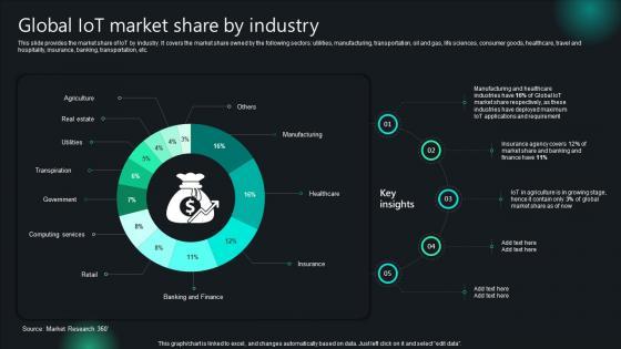 This slide provides the market share of IoT by industry. It covers the market share owned by the following sectors utilities, manufacturing, transportation, oil and gas, life sciences, consumer goods, healthcare, travel and hospitality, insurance, banking, transportation, etc. Explore a selection of the finest Unlocking Potential IoTs Application Global IoT Market Share By Industry IoT SS V here. With a plethora of professionally designed and pre-made slide templates, you can quickly and easily find the right one for your upcoming presentation. You can use our Unlocking Potential IoTs Application Global IoT Market Share By Industry IoT SS V to effectively convey your message to a wider audience. Slidegeeks has done a lot of research before preparing these presentation templates. The content can be personalized and the slides are highly editable. Grab templates today from Slidegeeks. This slide provides the market share of IoT by industry. It covers the market share owned by the following sectors utilities, manufacturing, transportation, oil and gas, life sciences, consumer goods, healthcare, travel and hospitality, insurance, banking, transportation, etc.