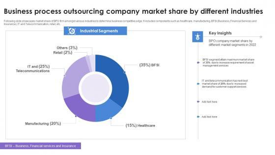 Following slide showcases market share of BPO firm amongst various industries to determine business competitive edge. It includes components such as healthcare, manufacturing, BFSI Business, Financial Services and Insurance, IT and Telecommunication, retail, etc. Pitch your topic with ease and precision using this Business Process Outsourcing Company Market Share By Different Industries Formats Pdf. This layout presents information on Telecommunications, Retail, Manufacturing. It is also available for immediate download and adjustment. So, changes can be made in the color, design, graphics or any other component to create a unique layout. Following slide showcases market share of BPO firm amongst various industries to determine business competitive edge. It includes components such as healthcare, manufacturing, BFSI Business, Financial Services and Insurance, IT and Telecommunication, retail, etc.