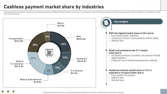 Following slide demonstrates market share of cashless transactions by different industries which can be used by businesses to determine future prospects. It includes industries such as BFSI, healthcare, IT and telecom, media, retail, ecommerce, etc. Welcome to our selection of the Online Payment Techniques Cashless Payment Market Share By Industries. These are designed to help you showcase your creativity and bring your sphere to life. Planning and Innovation are essential for any business that is just starting out. This collection contains the designs that you need for your everyday presentations. All of our PowerPoints are 100Percent editable, so you can customize them to suit your needs. This multi-purpose template can be used in various situations. Grab these presentation templates today. Following slide demonstrates market share of cashless transactions by different industries which can be used by businesses to determine future prospects. It includes industries such as BFSI, healthcare, IT and telecom, media, retail, ecommerce, etc.