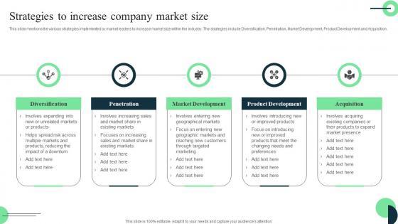 This slide mentions the various strategies implemented by market leaders to increase market size within the industry. The strategies include Diversification, Penetration, Market Development, Product Development and Acquisition. From laying roadmaps to briefing everything in detail, our templates are perfect for you. You can set the stage with your presentation slides. All you have to do is download these easy to edit and customizable templates. Enterprise Leaders Technique To Achieve Market Control Strategies To Increase Company Market Size Background PDF will help you deliver an outstanding performance that everyone would remember and praise you for. Do download this presentation today.